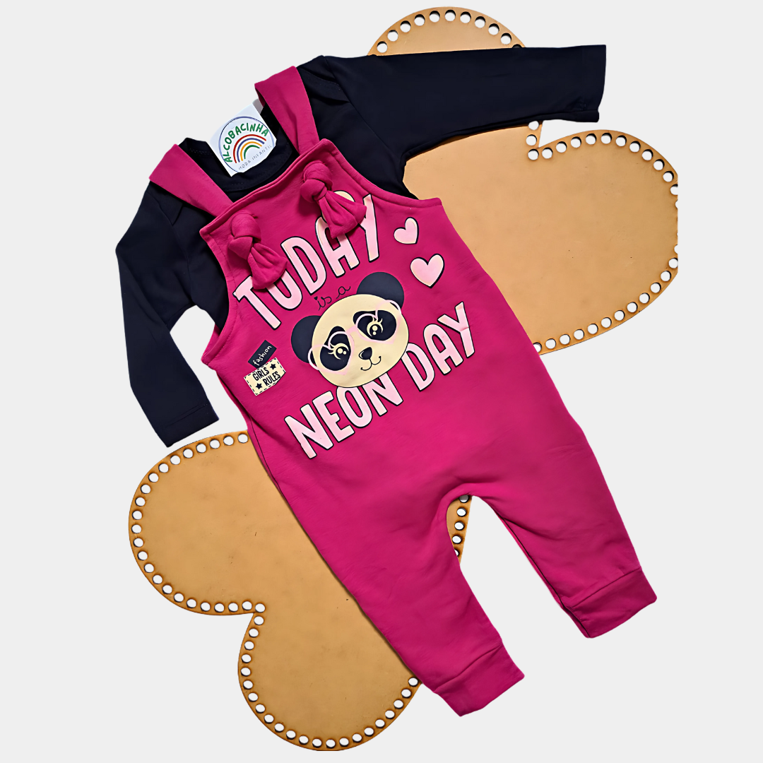 Conjunto Jardineira com Body Manga Longa em Moletinho Flanelado Pandinha