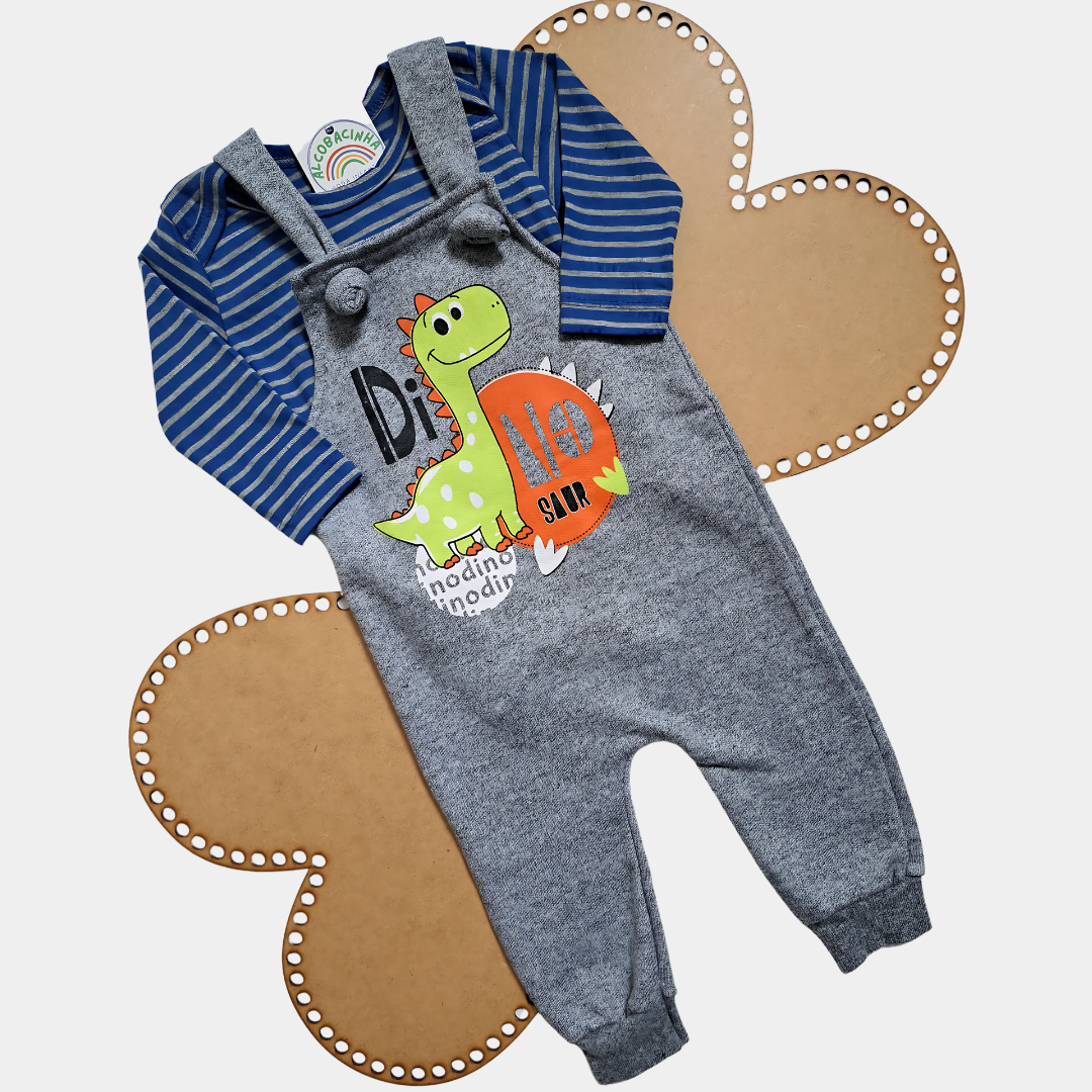 Conjunto Jardineira com Body Manga Longa em Moletinho Flanelado Dinossauro
