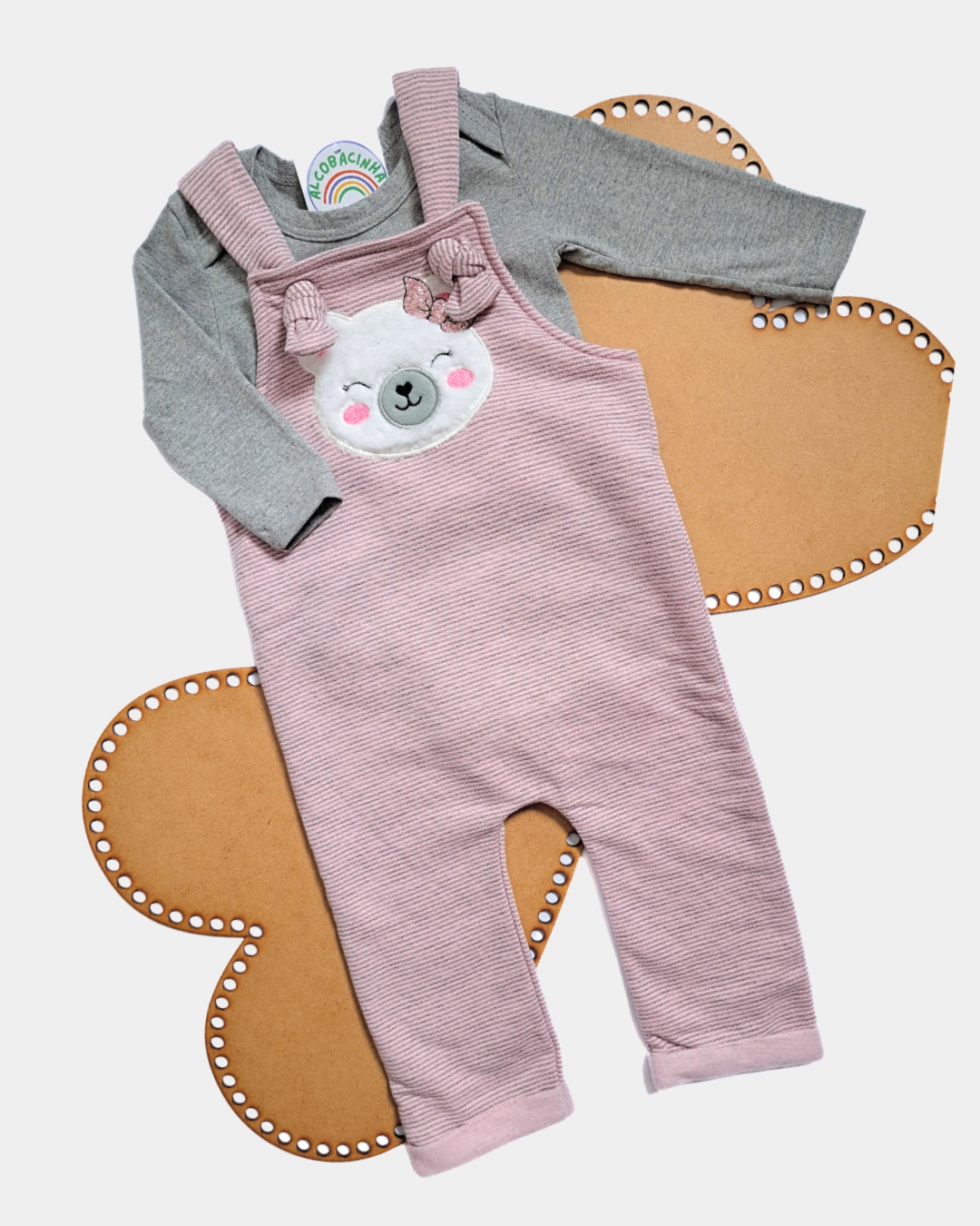 O charme deste look é o seu contraste de tons rosa e cinza e o detalhe de ursinho bordado, que trás um ar delicado para a peça.
