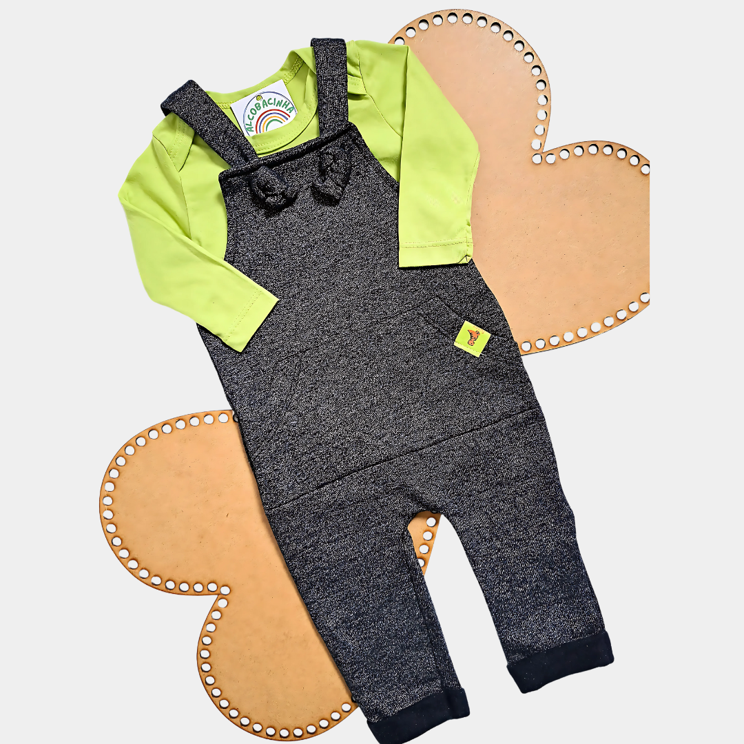 Conjunto infantil composto por uma jardineira e um body.