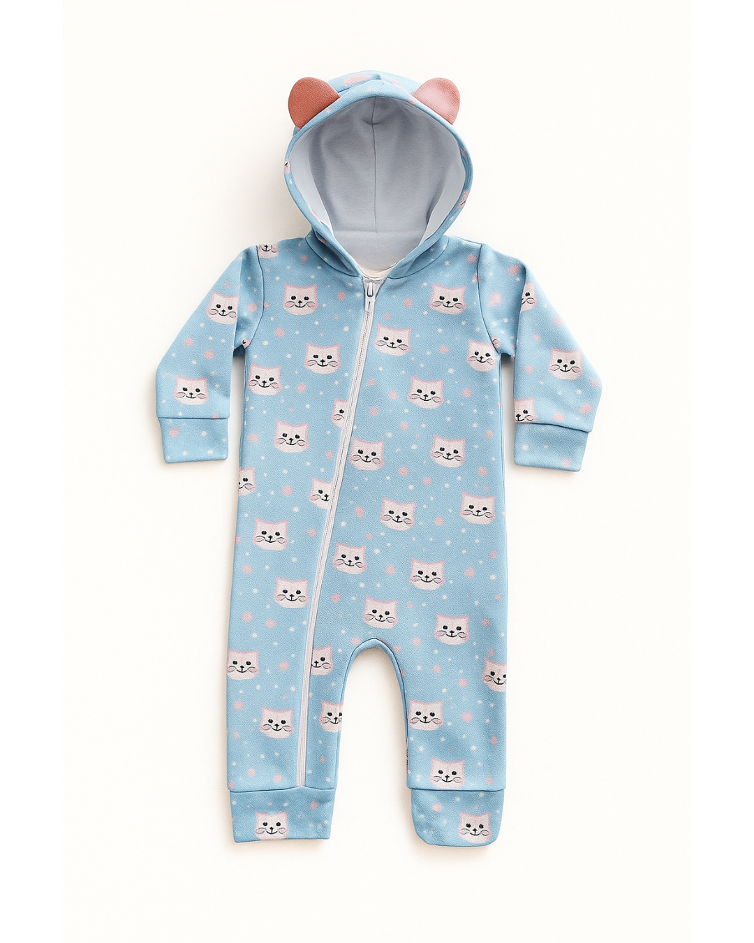 Macacão em Moletom Flanelado Gatinha com Capuz e Orelhinha Azul